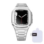 Apple Watch Series 9/8/7/6/5/4やSE第2/第1世代に対応のケースカバー。ステンレス製のシルバーバンドとレザーベルトのセット。45mm/44mm/41mm/40mm対応。液晶保護フィルム付きの並行輸入品。