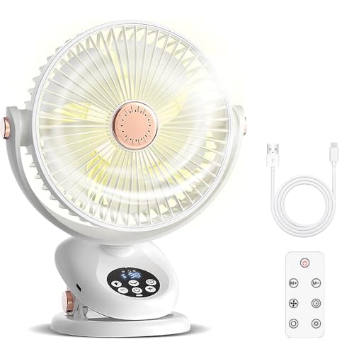 自動首振り機能を備えたクリップ式扇風機。5段階風量調節、タイマー、LEDライト搭載。リモコン操作可能で、アロマ対応。バッテリー4000mAhのType-C充電式、直径16.5cmの静音設計。