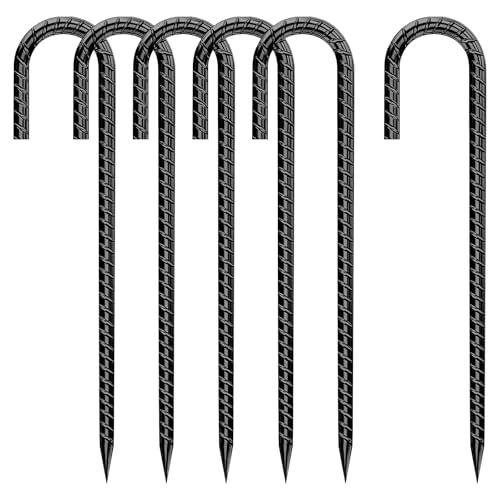 J型止めピンは30cmの長さと9mmの太さで、鍛造スチールの亜鉛メッキ加工。テントペグや建物アンカーに最適な6本セット。岩場や砂浜でも高安定性を誇ります。