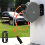aleawol エアホースリール 10mは自動巻き取り式で、壁掛けや天吊りが可能。180°回転し、エアホース外径φ8mm・内径5mmで多様な空圧工具に対応。クイックコネクタ付きで取付簡単。