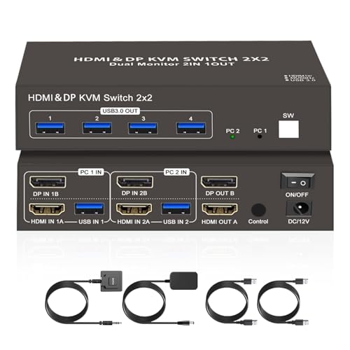 HDMI/DisplayPort KVM切替器。2台のPCを切り替え、デュアルモニター対応。4K 60Hz出力、USB3.0ハブ付き。手動スイッチでキーボード、マウス、コントローラーを共有可能。