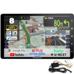 RoadQuest 8インチカーナビは、1280×800のIPSワイドHD液晶を搭載し、2025年版ゼンリン地図を提供。フルセグ、Bluetooth出力、ポータブル機能、アンドロイドナビ、ネット動画、バックカメラ接続対応。12V-24Vに対応しています。