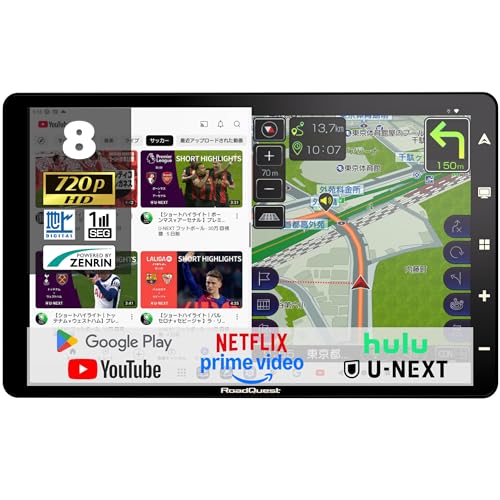 RoadQuest 8インチカーナビ、フルセグ対応のポータブルナビ。1280×800 IPSワイドHD液晶、2025年版ゼンリン地図搭載。Bluetooth出力、バックカメラ接続可能。12V-24V対応。ネット動画、タブレット機能あり。