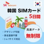 韓国SIMカード 5日間(120時間)、データ通信無制限、5G/4G対応。SKT回線使用、SIMフリー端末のみ対応。説明書付き、MEWMEWホームでの販売です。