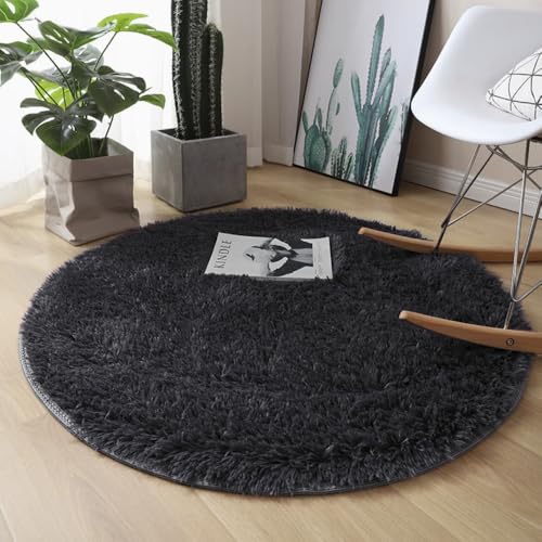 DIHACOZの円形ラグマットは185x185cm、厚さ約5cmで毛足約4cm。低反発・抗菌防臭加工、洗える、耐熱、静電気防止機能搭載。北欧風デザインで冬用に最適。ふわふわ触感の滑り止め付(ブラック、約2畳)。