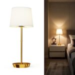 おしゃれな間接照明のテーブルランプ。コードレスで5000mAhの充電式バッテリー搭載。磁石とリモコン付、無段階調光、3色温度、RGB機能あり。目に優しくタッチ制御。ベッドサイドやデスクに最適。色はゴールド。