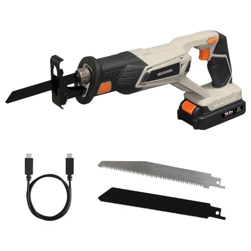 アイリスオーヤマの充電式レシプロソーJRS20TCは、18Vの電動のこぎりでType-C充電が可能。充電器不要で、木材用・鋼鉄用刃が付属し、サンドベージュのデザインです。