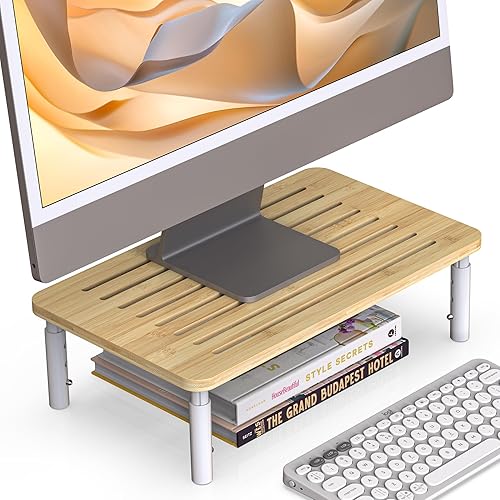 WELL WENGのモニター台は、高さ調整可能で39.5cmの幅を持つ天然竹製のデスクシェルフです。通気孔と滑り止めマット付きで、工具不要の簡単設置が魅力。整理整頓に最適なPCスタンドです。