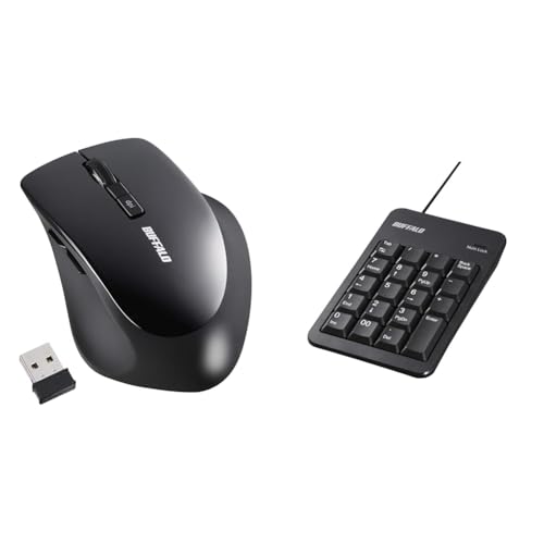 【セット買い】バッファローの静音ワイヤレスマウス(5ボタン、dpi切替、BlueLED)と、Tabキー付きの有線テンキーボード(ブラック)。デスク周りをスッキリさせる便利なアイテムです。