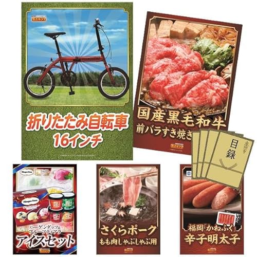 景品キングの忘年会景品15点セットには、折りたたみ自転車16インチと国産黒毛和牛前バラすきが含まれています。多様な景品で、忘年会を盛り上げる最適なセットです。
