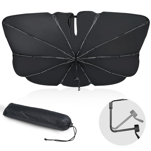 サンシェード 車 フロント【2025改良式曲がる中棒・強化十本骨】【ガラス繊維製の傘骨先端】傘式 車用サンシェード バックミラー開き口設計 フロント 遮光遮熱 UVカット カー用品 サンシェード 傘骨先端は折り曲げ可能 暑さ対策 紫外線日焼け対策 内装劣化防止 取付簡単 車パラソル 車中泊 露天駐車 収納ポーチ付き L(150*85CM) 高価買取中