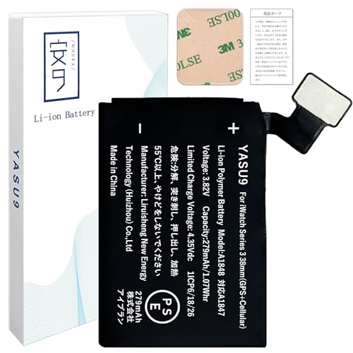 YASU9のiWatch Series 3 38mmバッテリー交換用。279mAh 3.82V、GPS/Cellular対応。PSE認証済みで、A1848/A1847などの機種に適用。