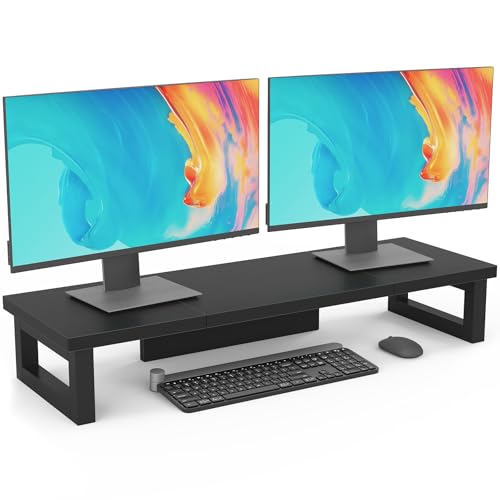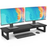 幅91cm、高さ11cmの2段モニター台。木製でデュアルモニター対応、耐荷重50kg。キーボード収納可。プリンターやタブレットパソコンにも適用(ブラック)。