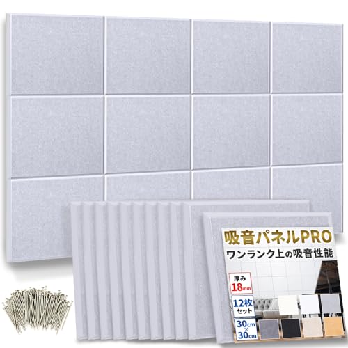防音ファストラボ®の吸音パネル「hisokaPRO」は、スクエア型の12枚セットで、音の悩みを軽減します。サイズは縦30cm×横30cm、厚さ18mmのライトグレー製品です。