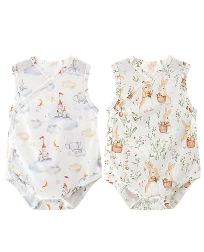 赤ちゃん用のロンパース2枚セットで、夏用の薄手ノースリーブ。竹繊維と綿混素材で快適。前開きタイプで、新生児向け。かわいい象と兎の動物柄。男の子にも女の子にもおすすめの出産祝いに最適。