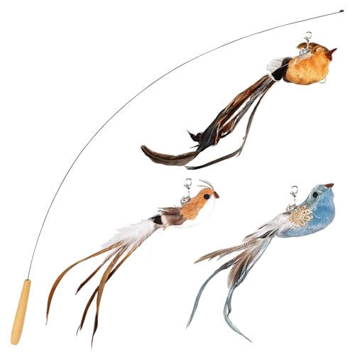 猫おもちゃのセット。鳥や羽のデザイン、鈴付きで猫の好奇心を刺激。頑丈な釣り竿は切替可能で、運動不足解消に最適。3セットでお得なペット用品。
