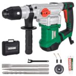 Deshuo 1-1/2インチ SDS-Max ロータリーハンマードリルは、12.5アンペアの強力なモーターを搭載し、3機能(ドリル、ハンマー、チゼル)を持ち、振動制御や安全クラッチ付きで、ドリルビット1個とノミ2個、キャリーケースが付属します。