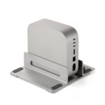 アルミ合金製の縦置きスタンドは、Mac mini M4/M4 Proと互換性あり。幅調節可能で、滑り止めブラケットと充電機能を搭載した多機能冷却ベースです。