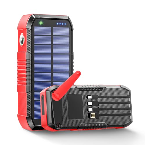 63200mAhの大容量ソーラーモバイルバッテリー。急速充電(22.5W/PD18W)対応、4本の内蔵ケーブル、IPX7防水、防塵、手回し充電可能。6台同時充電、LEDライト、コンパス搭載の耐衝撃設計。防災やアウトドアに最適。