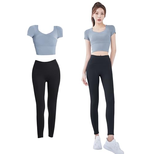 Nippawsのヨガウェアは、ハイウエストデザインで吸汗速乾性、通気性、伸縮性に優れています。揺れないブラジャー付きでしっかりサポート!2枚組の上下セット(Sサイズ、水色+ブラック)。