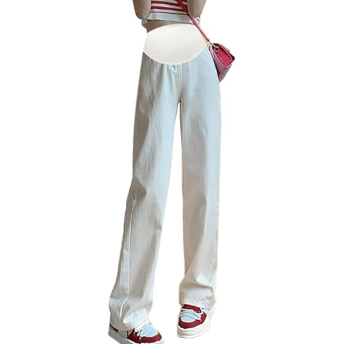 妊娠中の快適さを追求した、ウエスト調整可能なマタニティワイドデニムパンツ。初期から後期まで対応し、スタイルも楽しめるホワイトカラー。