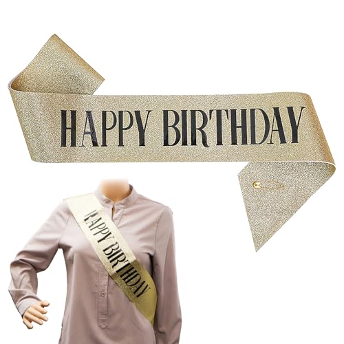 誕生日のパーティーを華やかに演出するゴールドのラメたすき。HAPPY BIRTHDAYのメッセージがきらきら輝き、特別な日を盛り上げます。飾り付けにぴったりのアイテムです。