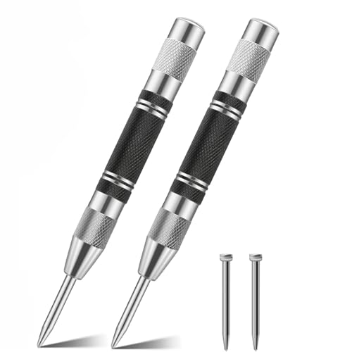 FUYUEROの自動穴あけパンチは、スチール製のスプリング式で、木材や金属、プラスチックに適しています。調整可能な衝撃力により精確なマーキングが可能。2本の予備針付き。