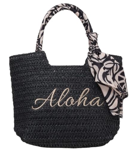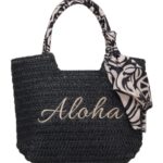 ハワイアンペーパー素材のミニトートバッグ。ALOHAロゴとスカーフ付き。夏にぴったりのデザインで、ハイビスカスやモンステラの柄が特徴。プチプラで可愛い雑貨として、ハワイのお土産にも最適です。