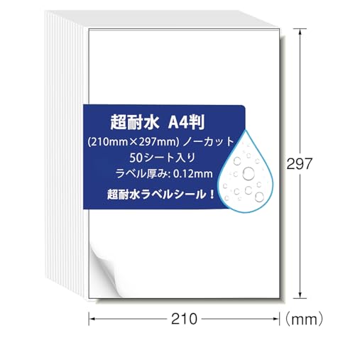 超耐水で強粘着のA4判ノーカットラベルシール。50シート入りで、レーザープリンターにも対応しています。耐久性に優れ、水濡れにも強いので、幅広い用途に最適です。