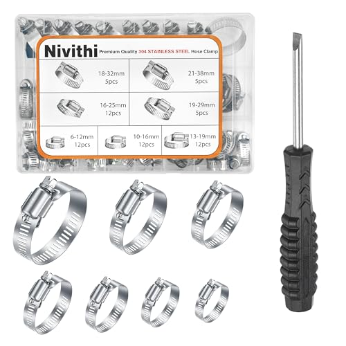 Nivithiホースバンドは、304ステンレス製で63個入り、7サイズ対応(φ6~38mm)。調整可能で強力に固定でき、配管や散水ホースの固定に最適です。