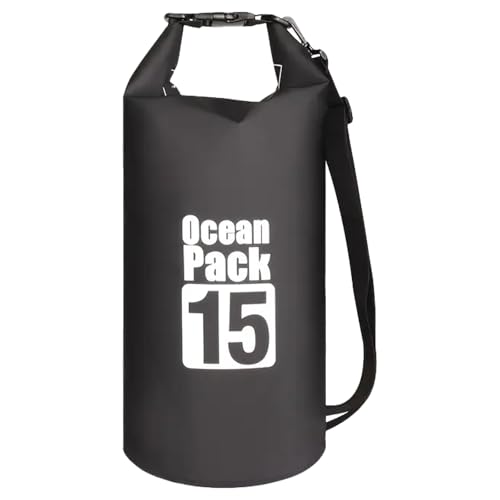 AWEの防水・防塵ドラム型バッグ。IPX6等級で水や埃から守ります。ショルダー付きで軽量、折りたたみ可能。海水浴、キャンプ、釣りなどのアウトドアに最適 (15L、ブラック)。