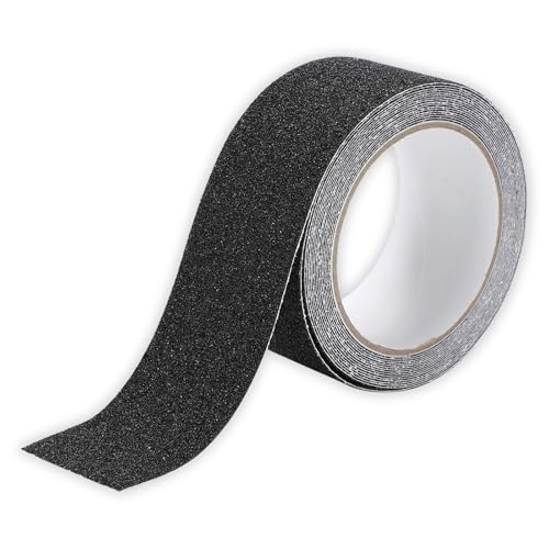 Rimikuru滑り止めテープは幅50mm、長さ5mの黒色テープで、階段や浴室、屋内外での使用に適しています。防水性があり、薄型で貼りやすい設計です。