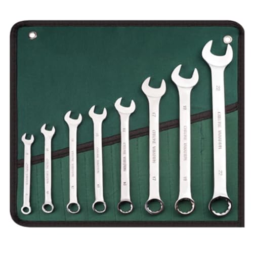極薄スパナセット8本組は、シ両口ミニレンチで8mm、10mm、12mm、13mm、14mm、17mm、19mm、22mmのサイズを含み、鏡面仕上げ済みです。精密作業に最適で、収納袋付きの作業工具です。