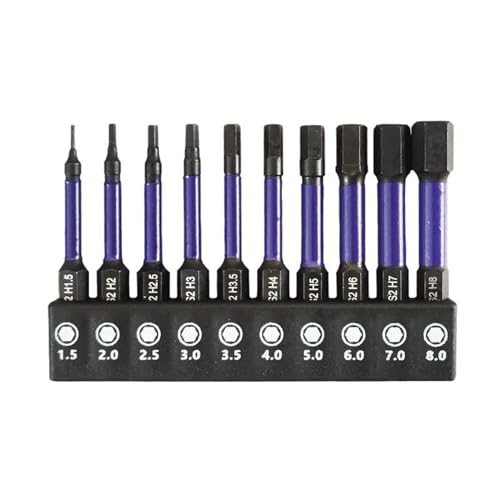 Tibemiの六角レンチセットは、内六角ビット10本が含まれ、サイズはH1.5mm〜H8mmで、50mmの長さ。S2合金鋼製で高硬度、磷化処理済み。1/4インチ六角軸で電動ドライバーに対応。パープルカラー。