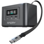 AFERIY 145W ポータブル電源は99.2Wh/31000mAhの容量、内蔵Type-Cケーブル、PD3.0対応、双方向USB-CポートとUSB-Aポートを搭載。家庭用・アウトドアに最適で、飛行機持ち込み可。