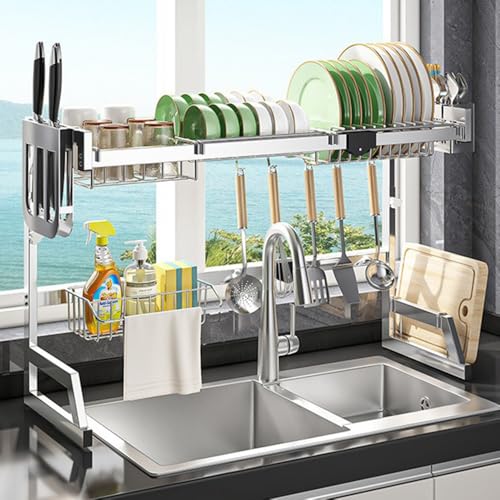 Dingtianlidiの水切りラックは、スチール製で錆びず、伸縮式で大容量。省スペース設計、箸やまな板の収納もでき、組み立ても簡単です。サイズは85-105cmに調整可能です。