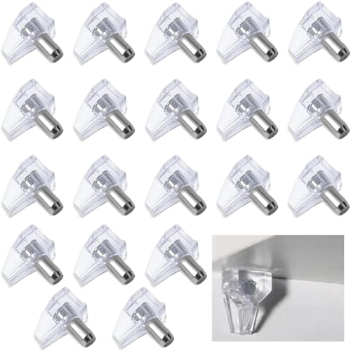 棚ダボ20個セット。ピン径5mmの金属製とプラスチック型。ワードローブやキャビネットの仕切り、家具固定に最適。透明で目立たず、さまざまなインテリアにマッチ。