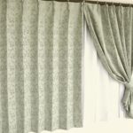 日本製の遮光・非遮光形状記憶グリーンカーテン、メイベグリーン。150cm×220cmのサイズで、花柄と葉柄デザインが特徴。癒しと安らぎを提供し、シンプルな和室にも最適です。