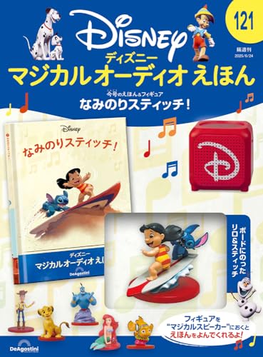 ディズニー マジカル オーディオ えほん 第121号は、なみのりスティッチをテーマにした分冊百科です。絵本とフィギュアが付属し、音声とともに物語を楽しめます。