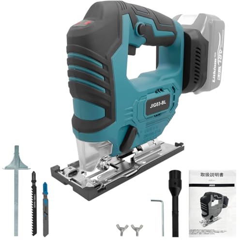マキタ互換の充電式ジグソー、18V・14.4Vバッテリー対応。ブラシレスモーター搭載、木材最大80mm、軟鋼板5mm切断。6段階速度調整、LEDライト付きでDIYに最適。モデル: Longsafe (JIG03-BL)
