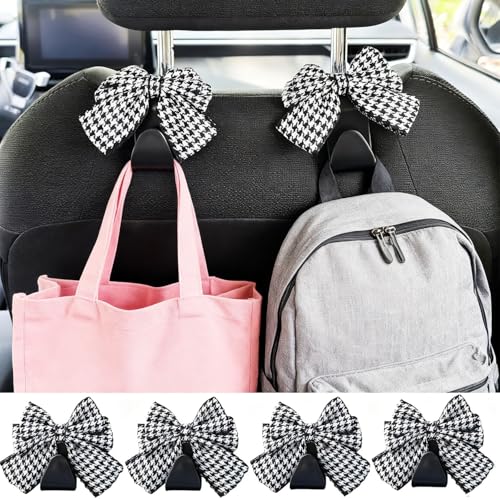 4個セットの車用ヘッドレストフック。耐久性に優れたPVC素材で耐荷重は10kg。かわいいリボンデザインがポイントで、シートに簡単取り付けできる収納フック。