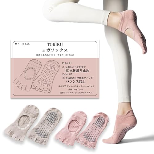 TORIKUのピラティス用靴下は、5本指デザインで滑り止め付き。冷房対策に最適で、通気性、吸湿性、速乾性を兼ね備えています。抗菌防臭機能付きで色あせない綿素材。2セット(ピンク&ベージュ)でフリーサイズ、スポーツやダンスにおすすめです。