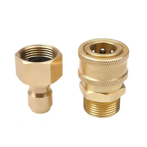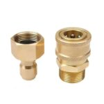 高圧洗浄機用のワンタッチホースカプラーアダプター。クイックコネクト設計で、3/8インチサイズ。N-M22オスとW-M22メスの接続に対応。手軽に取り付け・分解が可能で、効率的な使用を実現します。