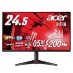 Acer Nitro VG250QX6bmiipxは、24.5インチIPSフルHDゲーミングモニター。200Hz、0.5msの応答速度、sRGB 99%対応。AMD FreeSync Premium、HDR10対応で、HDMI 2.0、DisplayPort v1.4、スピーカー・ヘッドフォン端子を搭載。