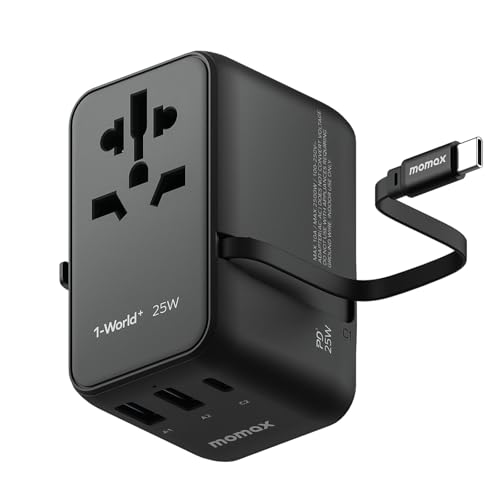 MOMAX 変換プラグはPD 25W出力で、タイプCケーブル内蔵。世界中で使用可能、5台同時充電対応。USB-C*2、USB-A*2、ACコンセント1口を備え、ヨーロッパ、韓国、イギリス、アメリカ、オーストラリアに対応。