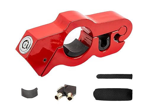 バイク用ハンドルロック(防犯アイテム)レッド。頑丈な素材で耐久性があり、高い防犯効果を実現。簡単操作で取り付け可能、持ち運びにも便利。安全な駐輪をサポートします。