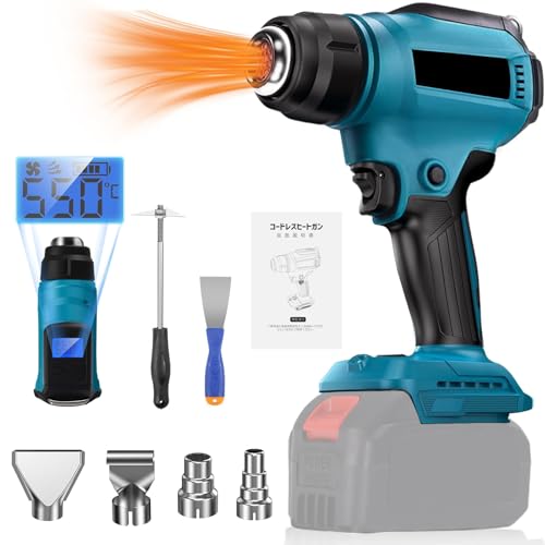 コードレスの小型ヒートガン。LCDディスプレイで温度は30~550℃まで調整可能。2段階の風速、4つのノズル付属。マキタ18Vバッテリーと互換性あり。急速加温やPVC、レジンの加工、塗料剥離に最適。