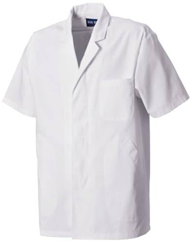 ユニフォームジャパンの男性用白衣は、襟付き半袖でサイズはS〜4L。シェフやコックに最適な業務用作業着で、清潔感のあるホワイトカラーが特徴です。