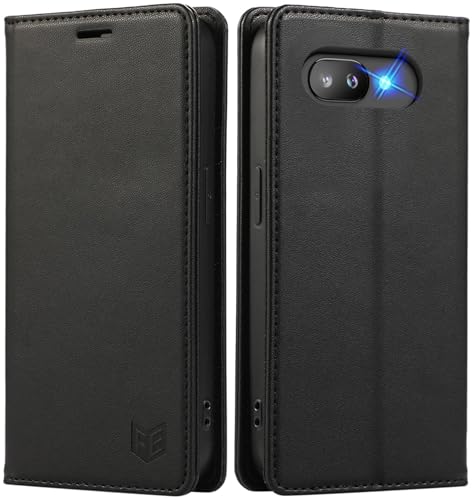 Google Pixel 9a 対応の手帳型ケース。高級PUレザー製でカード収納、マグネット閉じ具、スタンド機能を備えています。全面保護設計で、ブラックカラーです。