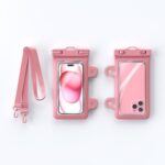 防水電話バッグは吸盤付きで壁掛け可能。全てのiPhoneモデルに対応し、入浴中でも安心して使用できます。ストラップと複数のカラーオプション(ブルー含む)が付属しています。